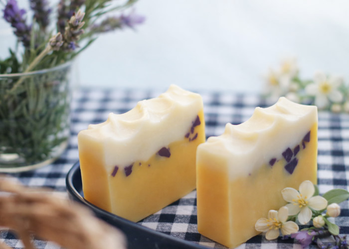 オリーブオイルエキストラバージン、RSPO認定パームオイル、ココナツオイル、シーバックソーンオイル、精製水、水酸化ナトリウム、ネロリウォーター、ラベンダーウォーター、コエンザイムQ10、酸化鉄レッド、ウルトラマリンバイオレット、ネロリプレミアム精油、ネロリBN精油、ラベンダー精油