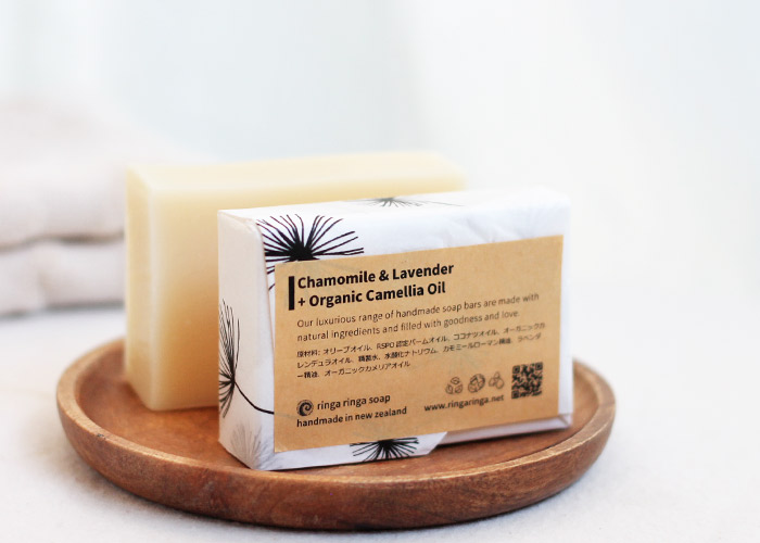「原材料」オリーブオイルエキストラバージン、RSPO認定パームオイル、ココナツオイル、オーガニックカレンデュラオイル、精製水、水酸化ナトリウム、カモミールローマン精油、ラベンダー精油、オーガニックカメリアオイル