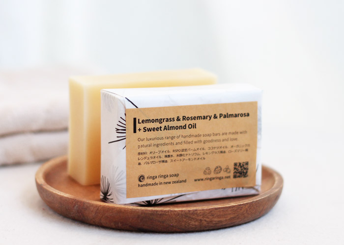 「原材料」オリーブオイルエキストラバージン、RSPO認定パームオイル、ココナツオイル、オーガニックカレンデュラオイル、精製水、水酸化ナトリウム、レモングラス精油、ローズマリー精油、パルマローザ精油、スイートアーモンドオイル
