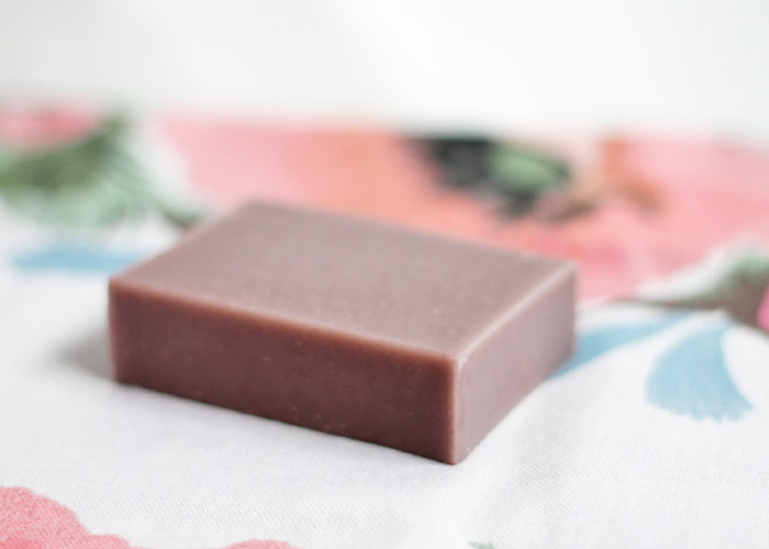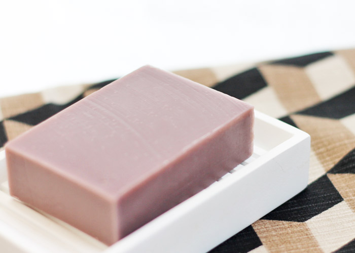 「原材料」オリーブオイル、RSPO認定パームオイル、ココナツオイル、オーガニックカレンデュラオイル、精製水、水酸化ナトリウム、ラベンダー精油、パープルクレイ